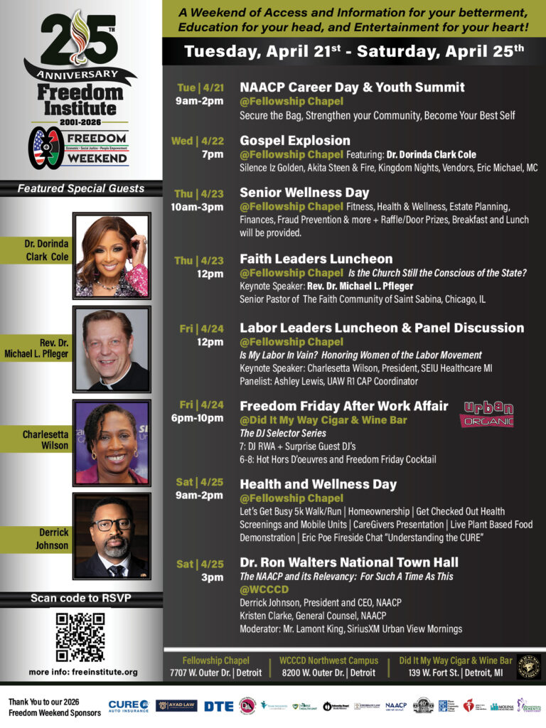 Posted on April 16, 2026 Posted By: Sydgrafix Categories: Community Outreach, Freedom Institute It’s the 25th Anniversary of the Freedom Weekend Conference Register or volunteer at freeinstitute.orgApril 21-April 25, 2026